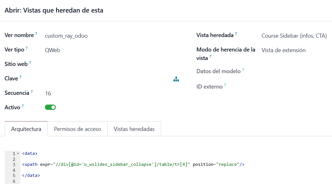 Desde el menú Vistas, busque la vista "Course Sidebar (infos, CTA)" y abre la que tiene clave como "website_slides.course_sidebar"
