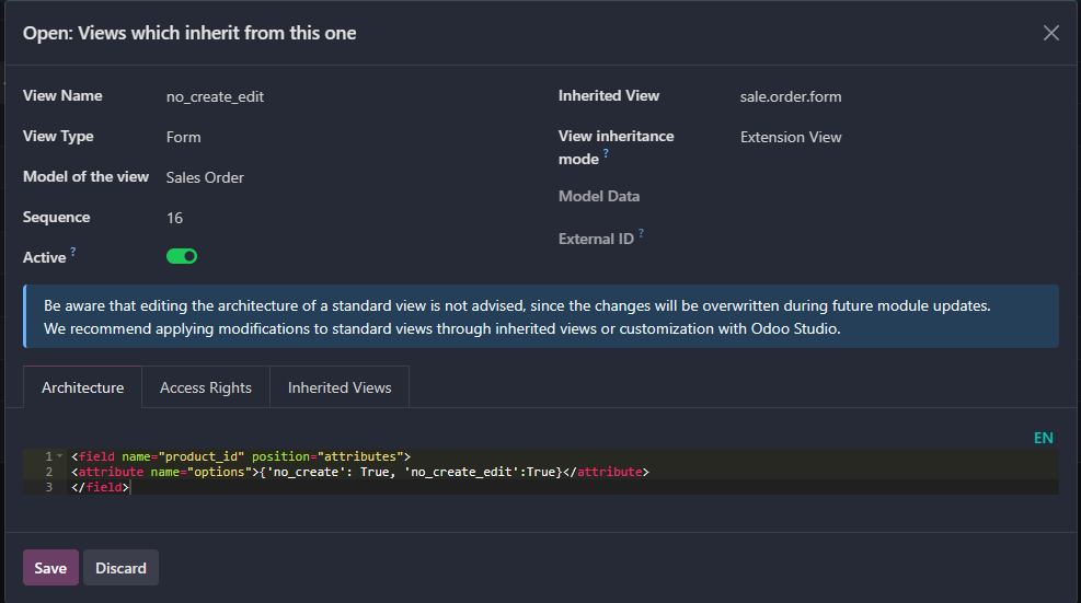 You can inherit the form view of the sales order and invoicing. Add the attribute ‘options’ to the field and make no_create_edit values True. eg: