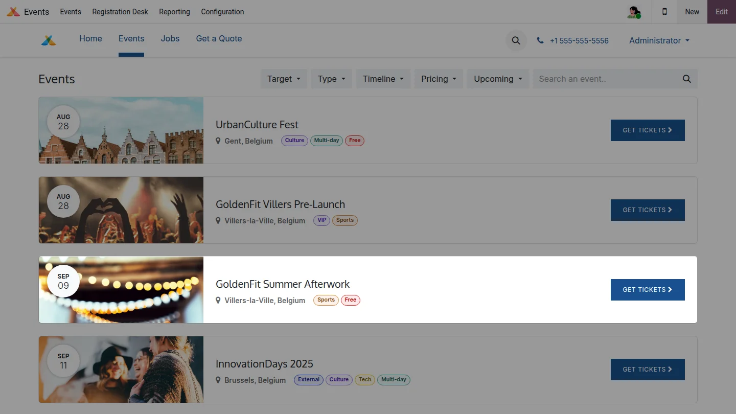 Odoo covers all aspects of an event planner's job, from event organization and admin tasks to ticket sales and promotion.