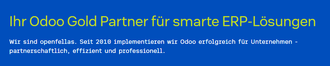 Als zertifizierter Odoo Gold Partner seit 2014 sowie Nr. 1 Partner im DACH-Raum, zählen wir weltweit zu den renommiertesten Dienstleistern im Bereich Odoo-basierter Unternehmenslösungen und -implementierungen. Wir begleiten Unternehmen unterschiedlichster Branchen bei der digitalen Transformation und unterstützt bei der Einführung, Anpassung und Optimierung von Odoo. | München, Freiburg, Ulm, Salzburg und Wien ![]() |