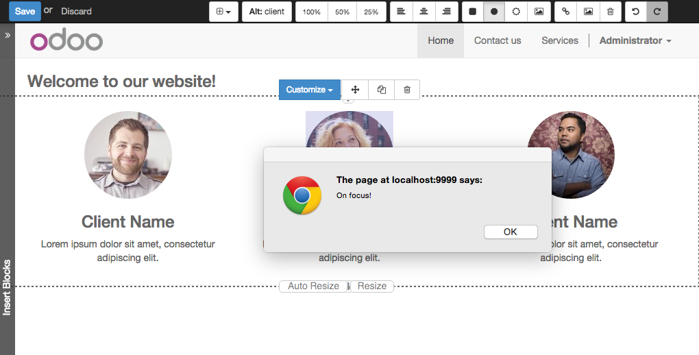 Creating themes for Odoo is a total change of perspective. Instead of defining the complete layout for a page, you can create blocks (snippets) at let the user choose where to “drag&drop” them, creating the page layout on their own. We call this modular design.