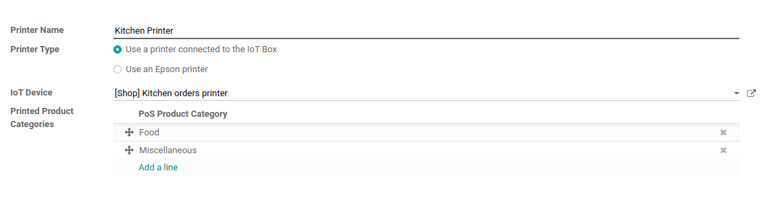Now, go to the Printers menu. Hit create, select the printer from the dropdown and, in the Printer Product Categories field, choose all the categories of products that should be printed on this printer.