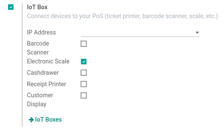 Now, choose the IoT Box in the dropdown menu and check the Electronic Scale option. Then, you hit save.