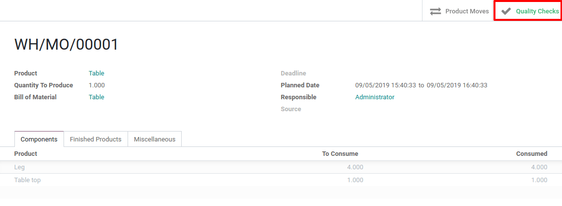 Once you have performed your quality checks, you can find them via the Quality Checks button available on the manufacturing order form.