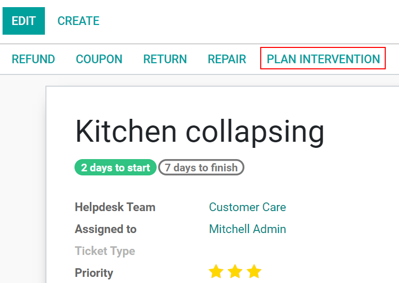 Klik op de ticketpagina op Interventie plannen en stel uw interventie ter plaatse op precies dezelfde manier in als in de Field Service-toepassing.