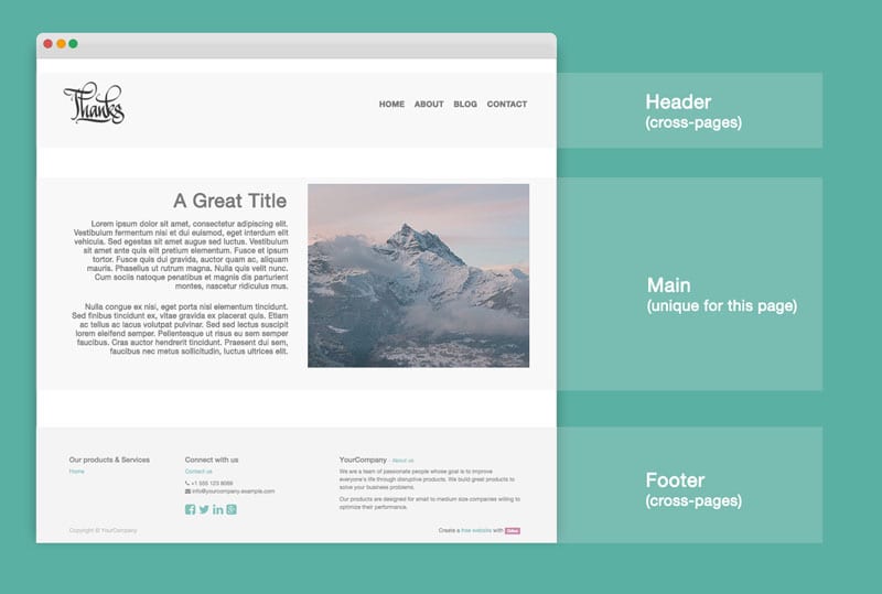 An Odoo page is the visual result of a combination of 2 kind of elements, cross-pages and unique. By default, Odoo provides you with a Header and a Footer (cross-pages) and a unique main element that contains the content that makes your page unique.