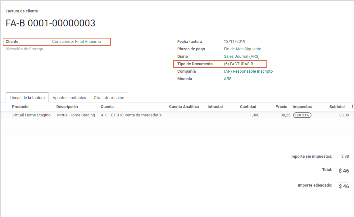 Invoice for a customer IVA Responsable Inscripto, prefix A.