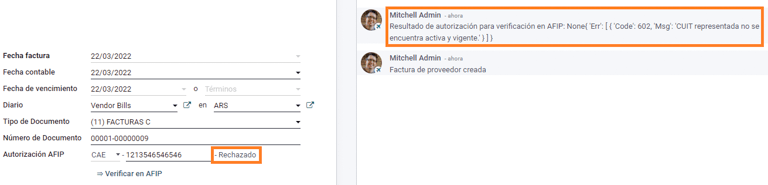 In case the vendor bill cannot be validated in AFIP, a value of Rejected will be displayed on the dashboard and the details of the invalidation will be added to the chatter.