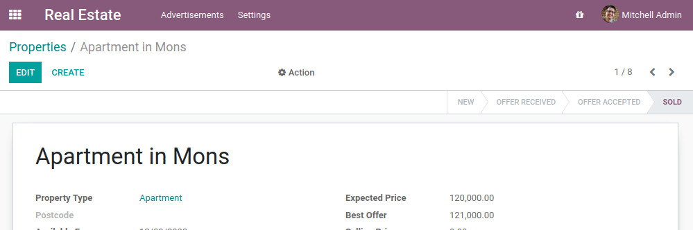 In our real estate module, we never had to develop anything specific to be able to do the standard CRUD actions. The Odoo framework provides the necessary tools to do them. In fact, such actions are already included in our model thanks to classical Python inheritance: