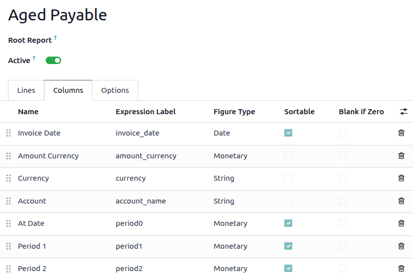 I resoconti possono avere un numero indefinito di colonne da visualizzare. Ogni colonna ottiene i suoi valori dalle espressioni dichiarate sulle righe. Il campo expression_label della colonna fornisce l’etichetta delle espressioni il cui valore viene visualizzato. Se una riga non ha alcuna espressione in quel campo, non viene visualizzato nulla in questa colonna. Se sono necessarie più colonne, è necessario utilizzare etichette di espressione diverse.