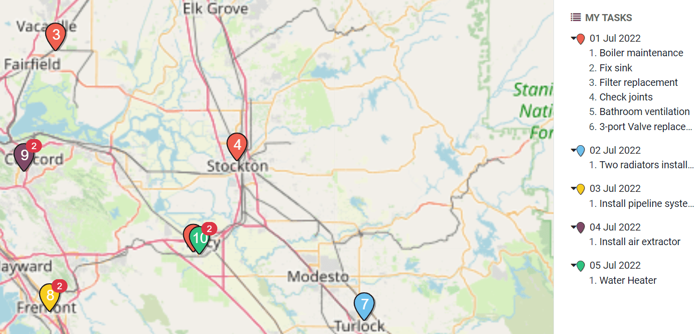 La vue Carte permet d’afficher des enregistrements sur une carte. Par exemple, elle est utilisée dans l’application Services sur site pour planifier un itinéraire entre différentes tâches.