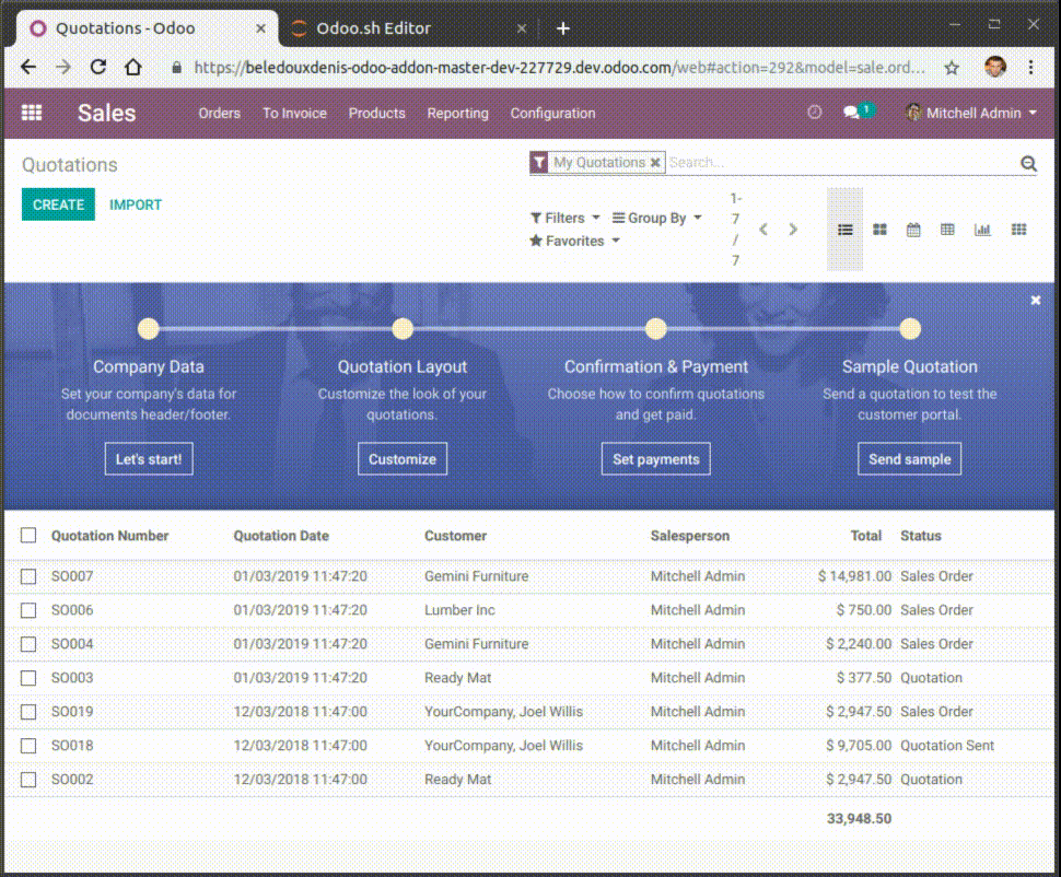 The online editor allows you to edit the source code of your builds from a web browser. It also gives you the possibility to open terminals, Python consoles, Odoo Shell consoles and Notebooks.