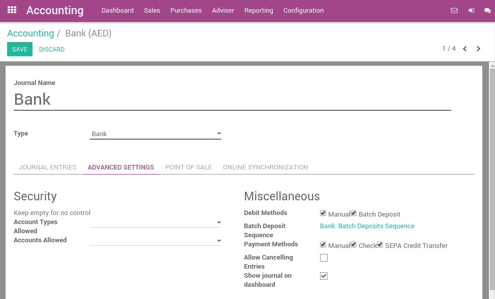To activate SEPA, click the Advanced Settings tab and, in the Payment Methods part of the Miscellaneous section, check the box Sepa Credit Transfer.