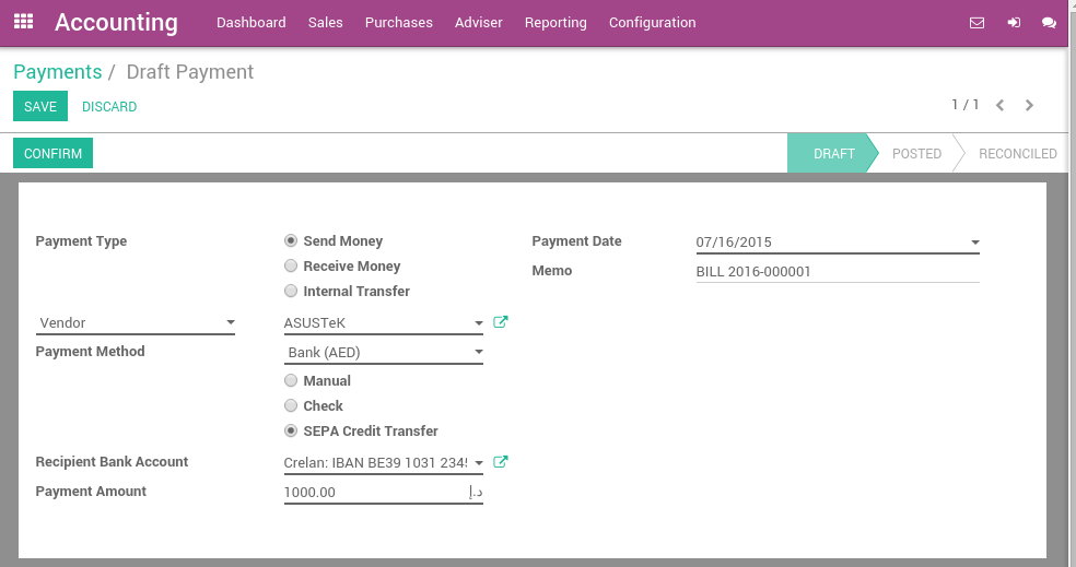 Once your payment is registered, don't forget to Confirm it. You can also pay vendor bills from the bill directly using the Register Payment button on top of a vendor bill. The form is the same, but the payment is directly linked to the bill and will be automatically reconciled to it.