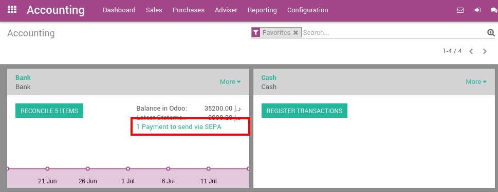 In order to allow payments by SEPA, you must activate the payment method on related bank journals. From the accounting dashboard (the screen you get when you enter the accounting application), click on "More" on your bank account and select the "Settings" option.