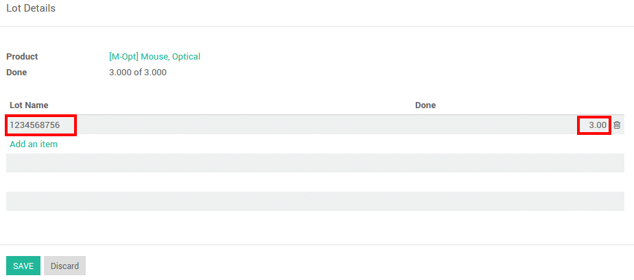 De clic en Agregar un ítem si el producto no ha sido inventariado aún. Puede fácilmente crear lotes, solo escriba el nuevo número de lote en la columna.