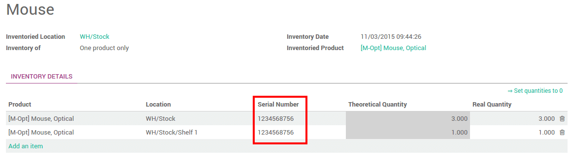 Cuando realice un inventario clásico, hay una columna Número de Serie. Si el producto ya le ha sido asignado un número, ya esta pre-llenado.