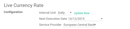 After having activated the currencies, you can configure the parameters to automate the currency rate update. These options are also in the settings of the Accounting application, in the bottom of the page:
