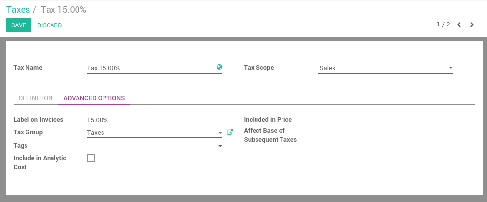 - Scope: Sales, Purchases or None (e.g. deprecated tax)