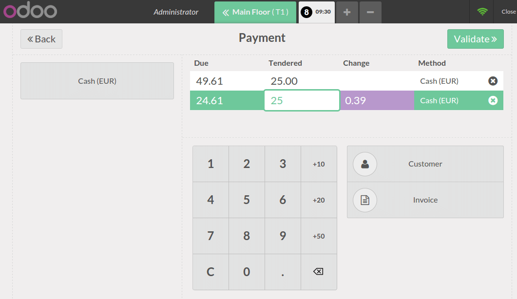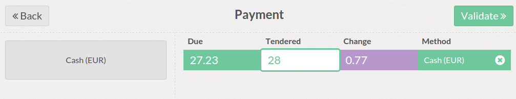 U krijgt het totaal, verwerkt de betaling en klikt op Valideer