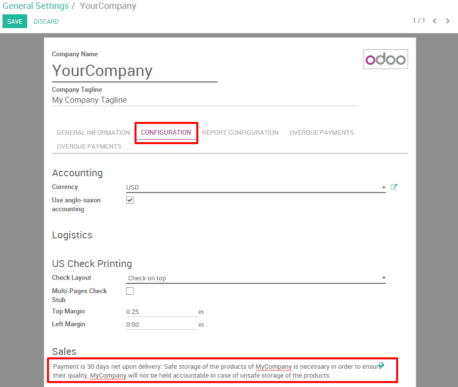 Let's take the following example: Your company sells water bottles to restaurants and you would like to add the following standard terms and conditions on all your quotations: