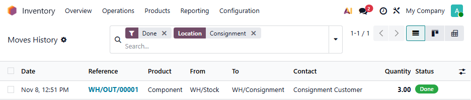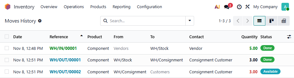 Create a Sales Order each time you want to consign products. The first Delivery will move them to the Consignment location (so they still show on your stock report). When you validate this, a second Delivery will be created reserving them so they are no longer "available". In this example, first we purchased 5 items, then sent 3 for consignment: