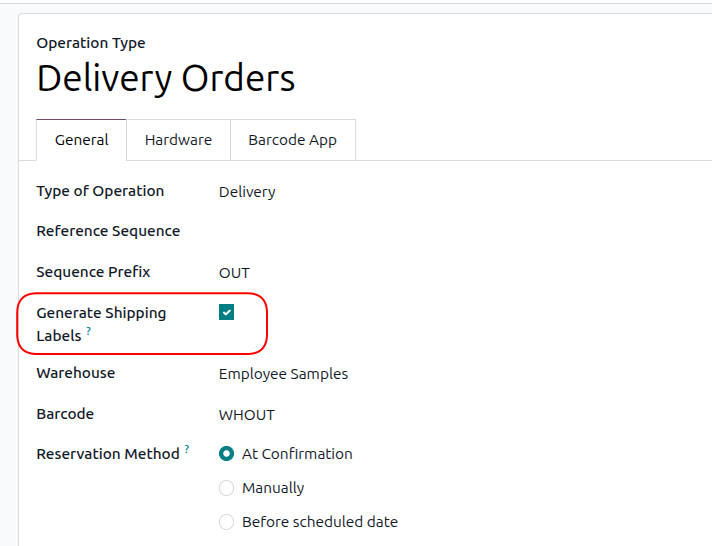 Depending on what shipment operation you selected for your warehouse (1 step, 2 step, or 3 step), you can set up when you'd like to have your shipping labels created. By default, shipping labels are created on the operation type: Delivery Orders (regardless of what step delivery) for a warehouse. You can modify these settings in Inventory > Configuration > Operation Types, then select the operation step you'd like to have them generated on. Make sure you only enable this on a SINGULAR/ONE operation step!