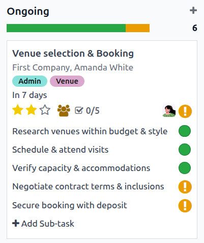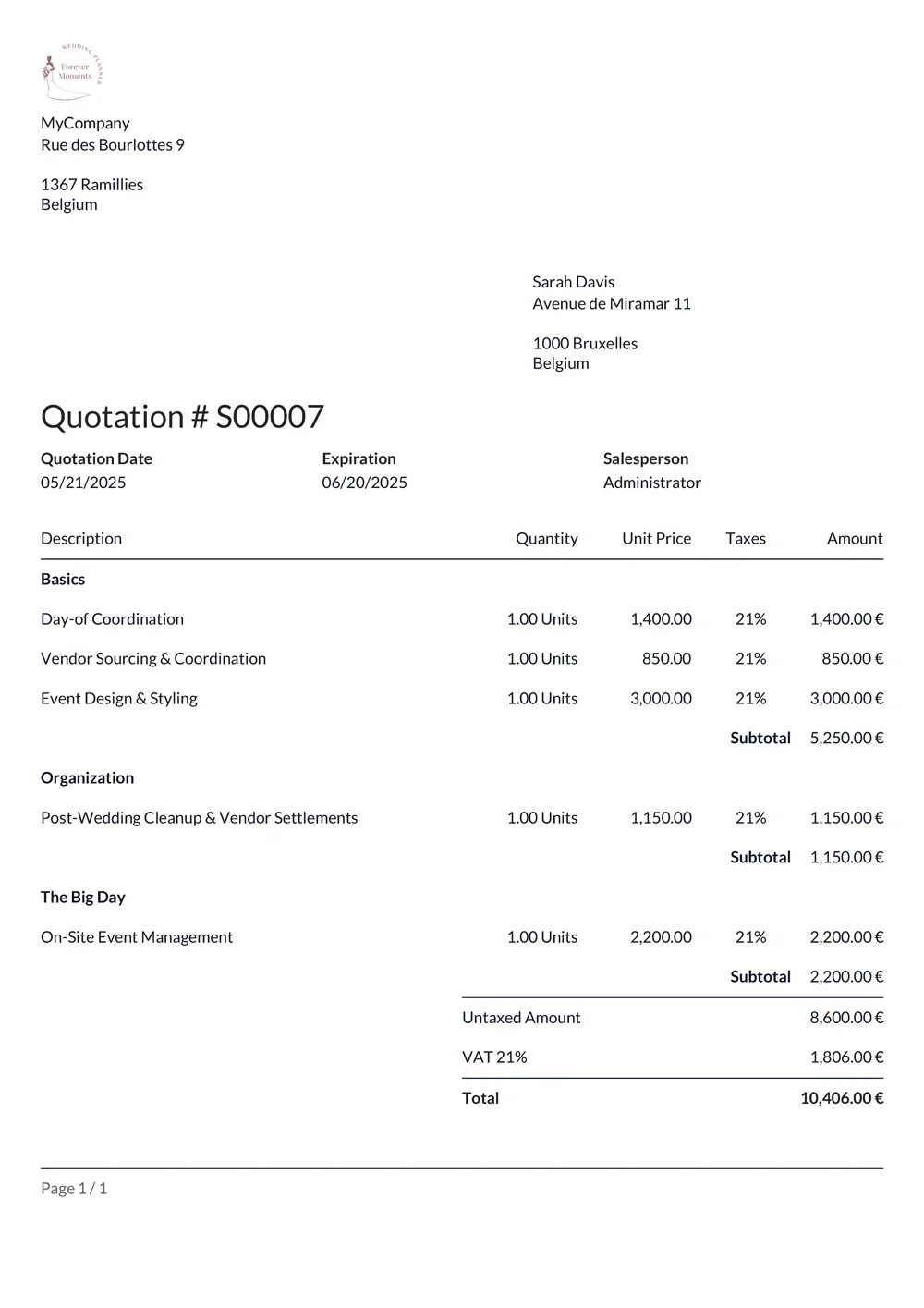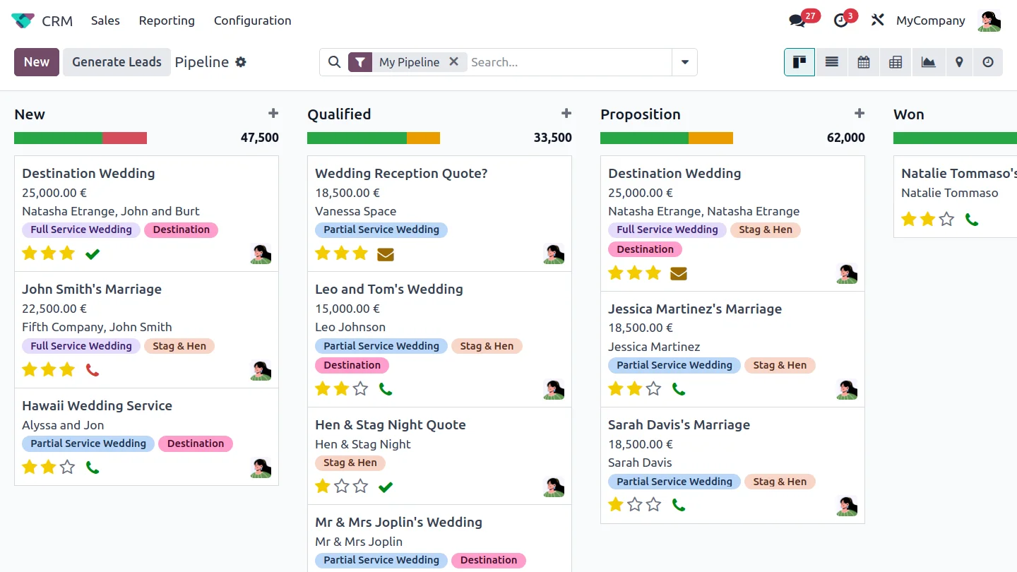 Use Odoo's wedding planner software to manage clients, send quotes fast, organize tasks for the big day, and handle invoices easily.
