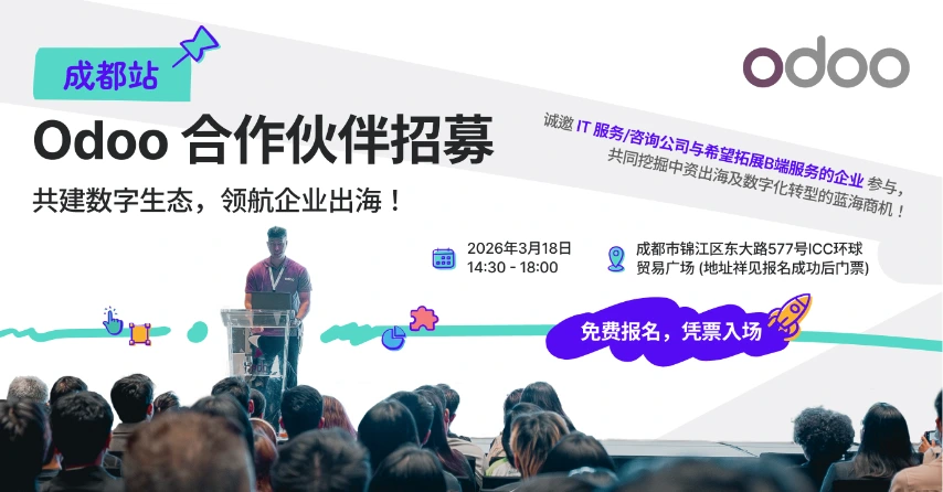 作为 2026 年度首站,成都招募专场将于 2026 年 3 月 18 日揭开序幕。 我们将带来 Odoo 的全球化商业势能与官方合作计划的深度拆解。