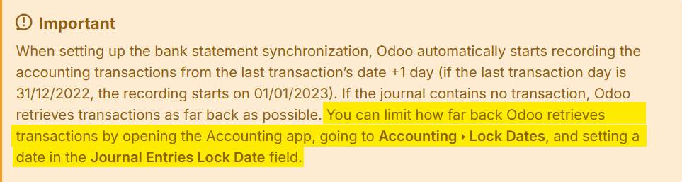 I try to load bank transactions from Jan 1st only, since I begin to use odoo from this date. Until now, I can only load the last 365 days, which means a lot of useless bank transactions open to tie in with invoices.