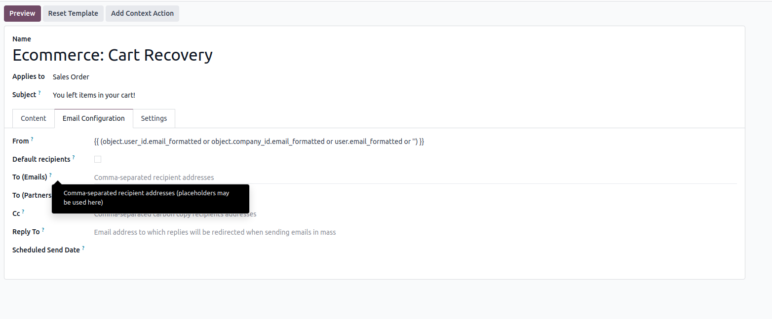 In odoo,while creating and email template "Email configuration" Tab is available there you can set the recipients name.