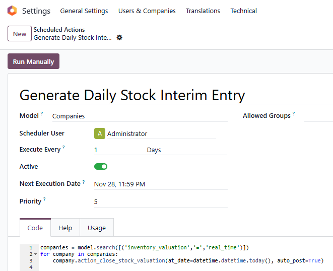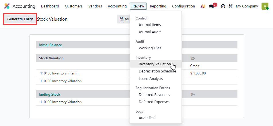 company.action_close_stock_valuation(at_date=datetime.datetime.today(), auto_post=True)This has the same effect as manually clicking GENERATE ENTRY from the new Inventory Valuation report: