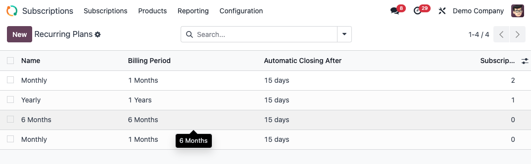 In the Subscriptions Module, go to the Configuration menu, and open "Recurring Plans".