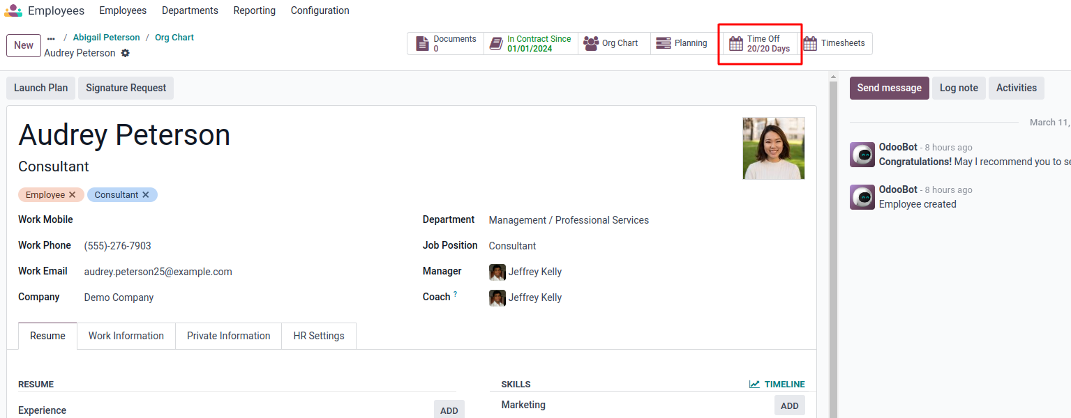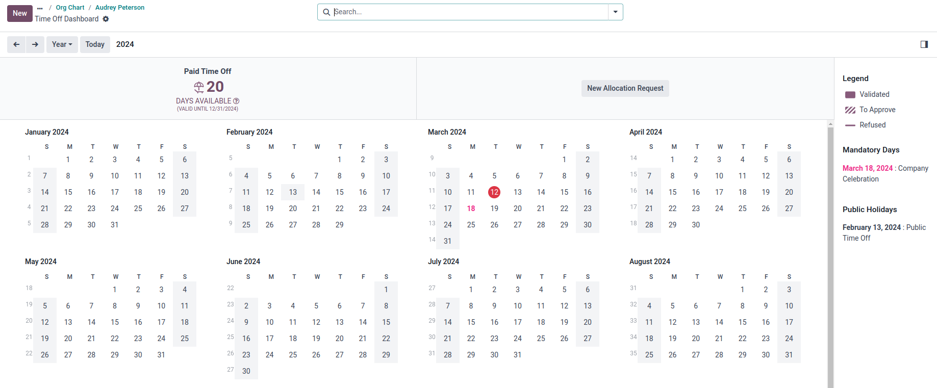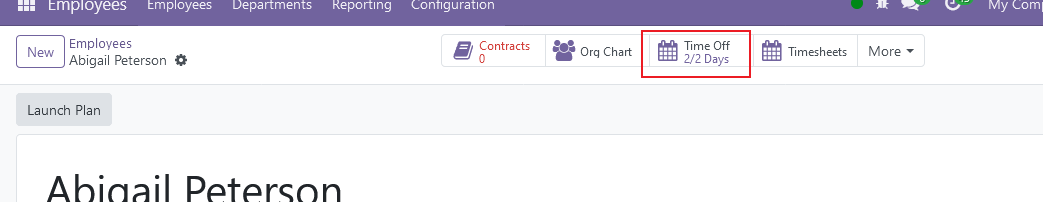 Click on the smart button to see more details on Time Off and to allocate new time off