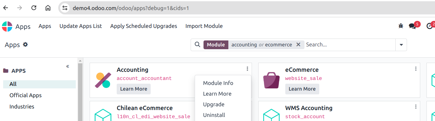 click on 3 dots option to uninstall accouting and same way e-commerce app.