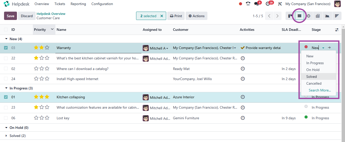 Yes, navigate to tickets from dashboard and view the tickets in list view. Select the tickets to be moved to a different stage. Click stage field (on one of the records) and select the required stage.