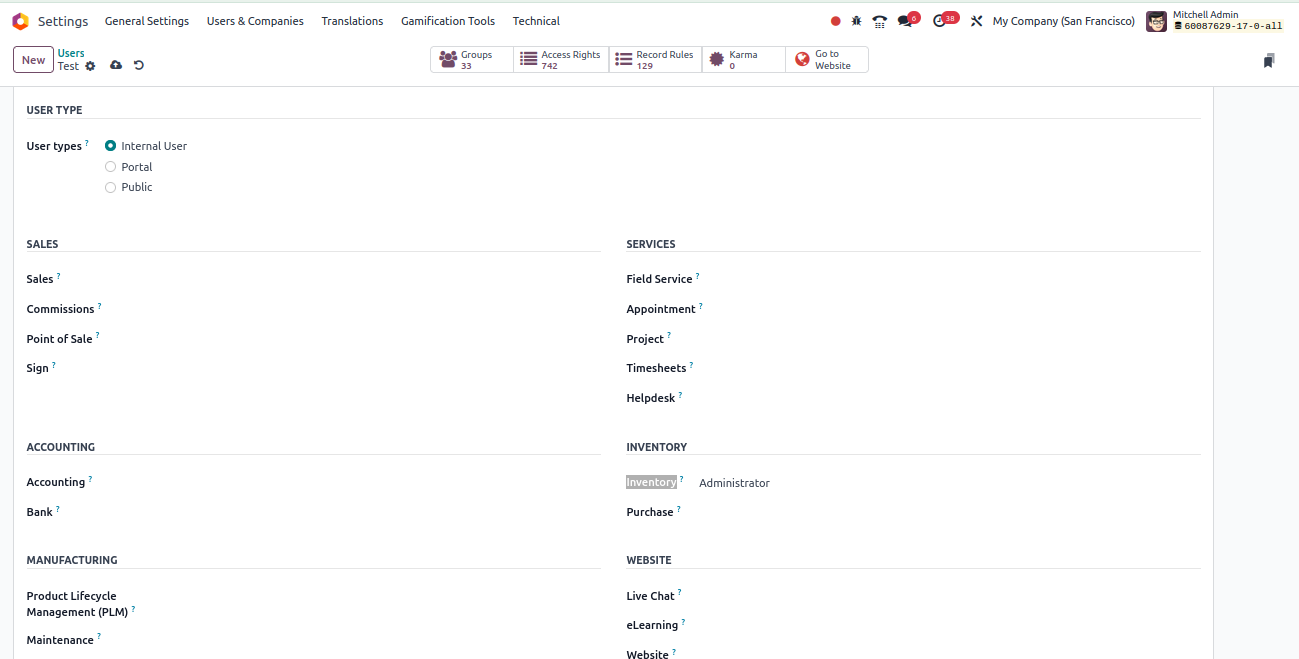 - In the "Access Rights" section, under the "Applications" tab, select the specific app(s) that the user should have access to, such as "Inventory."