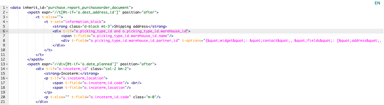 <div> <t t-esc="o.picking_type_id.warehouse_id.name"/><br/> <t t-esc="o.picking_type_id.warehouse_id.partner_id.street"/><br/> <t t-esc="o.picking_type_id.warehouse_id.partner_id.city"/> <t t-esc="o.picking_type_id.warehouse_id.partner_id.zip"/><br/> <t t-esc="o.picking_type_id.warehouse_id.partner_id.country_id.name"/> </div>