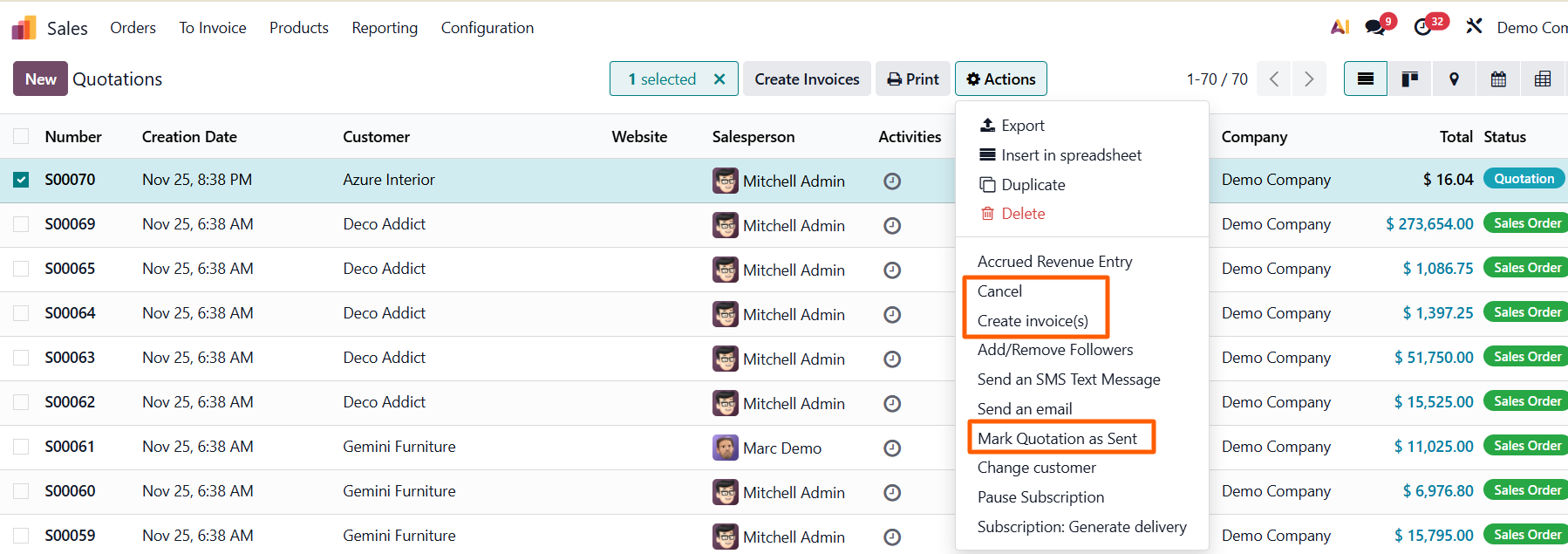 By default you can create invoices, cancel or quotation sent from list view. If you want to confirm multi quotation to orders then you can go with third party apps..