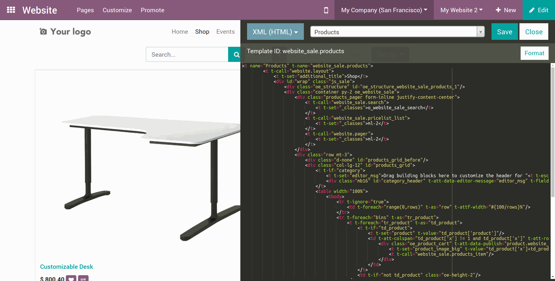 When you customize a dynamic page like the shop with the HTML editor, the new version of the view is saved as a new view and linked to the current website.