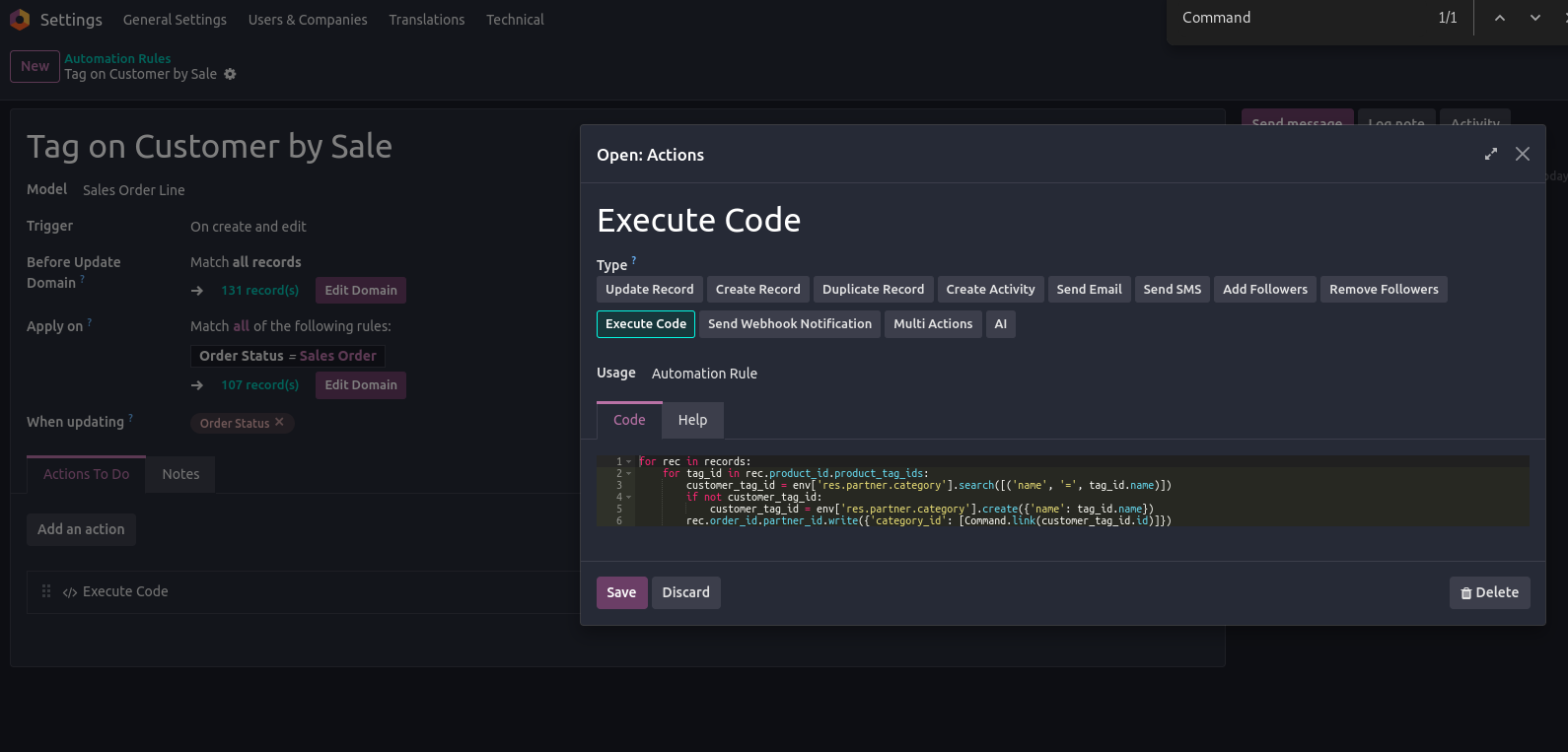 See also: https://www.odoo.com/documentation/19.0/applications/studio/automated_actions.html and https://www.odoo.com/documentation/19.0/developer/reference/backend/orm.html.