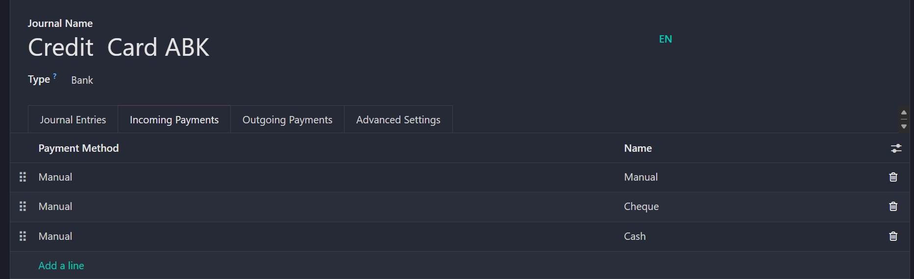 I noticed that you would like to include cash and cheque as payment methods in the Credit Card ABK journal.