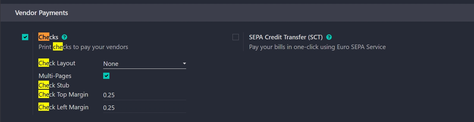 The second option involves enabling the checks feature found in the accounting settings under vendor payments.
