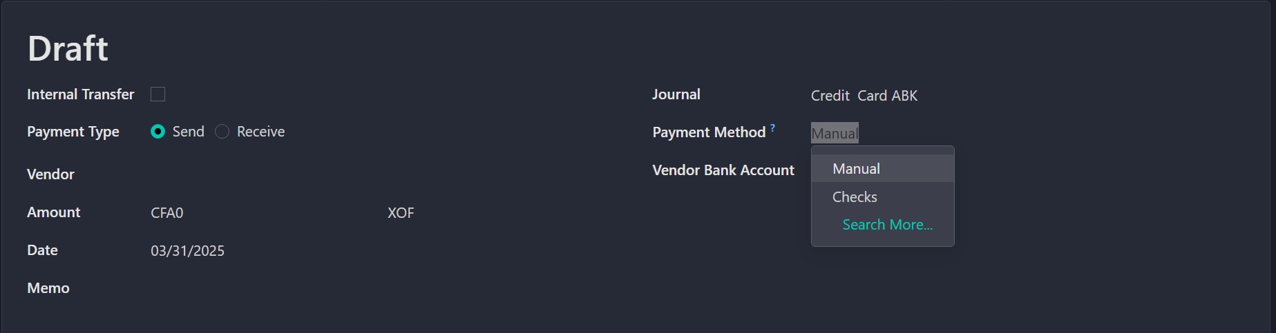 In vendor -Payment- new record - payment method -only Manual available - cash and Cheque how to enable