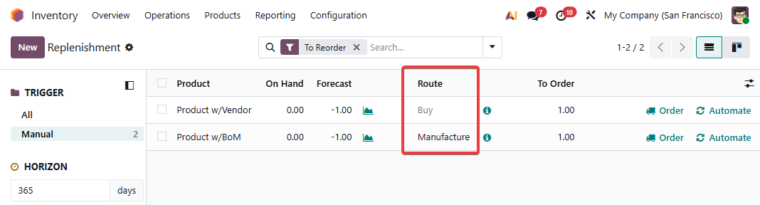 Product route configuration - Product routes are set automatically when possible (i.e., Buy route for purchase products and Manufacture route for products with bills of materials).