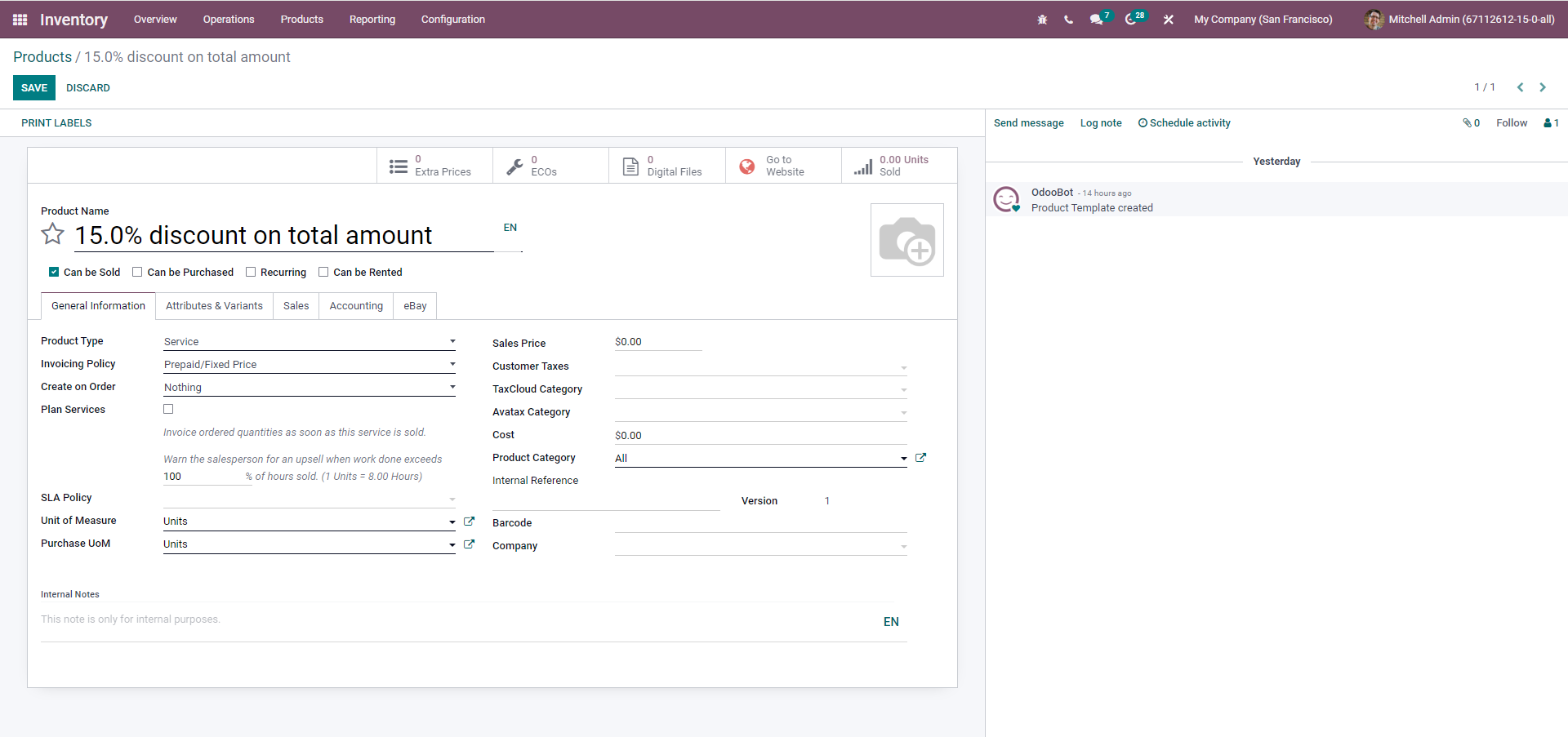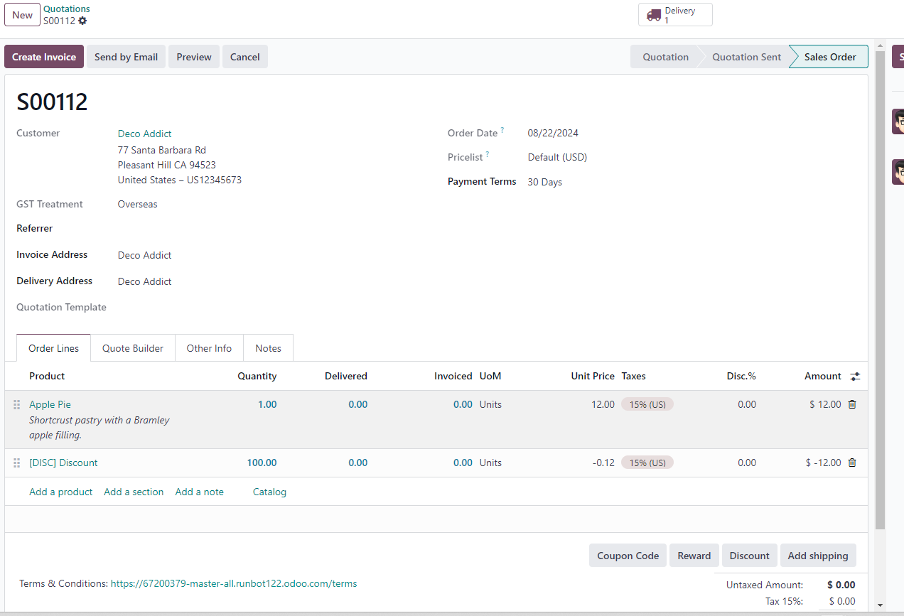We just migrated from Netsuite, and it used to have a part type called discount which would act as a markup/discount of the line above, and wondering if Odoo had something similar.  When the item ("discount" in the example below) was added to the order, it would take the previous line, and calculate the total.