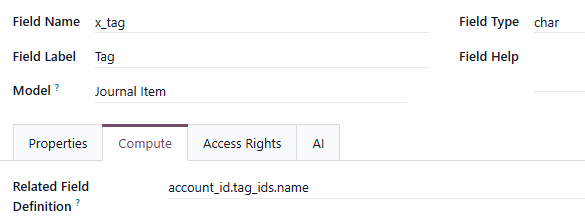 The Line Grouping part of the documentation discusses creating a new field on the Journal Item but I am unsure if this is the correct approach and have not been able to create a Tag based field due to the error "Field x_tag_ids of account.move.line cannot be used in a groupby expression."