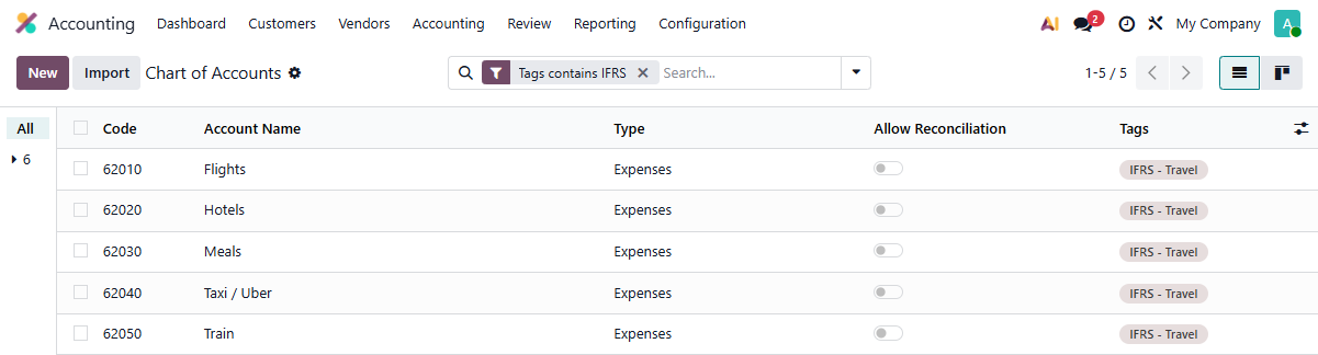 If I have five expense accounts under GAAP but wanted a single balance under IFRS how would I do this in Odoo?