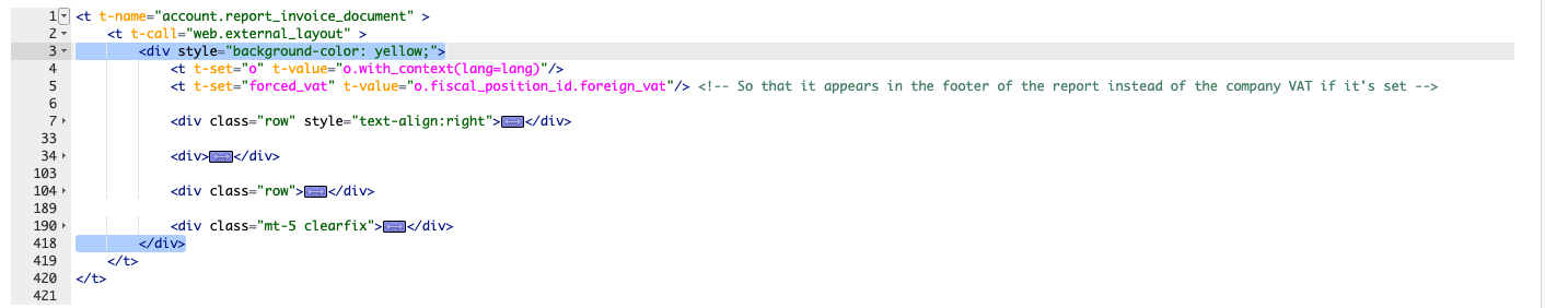 However, this color change will affect the inner box of the invoice only. You will need to add another element code to other files, for example the external_layout_standard to change the outer line of the invoice report boxes.