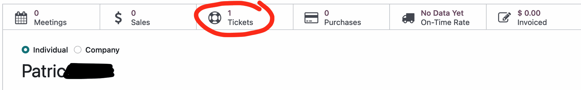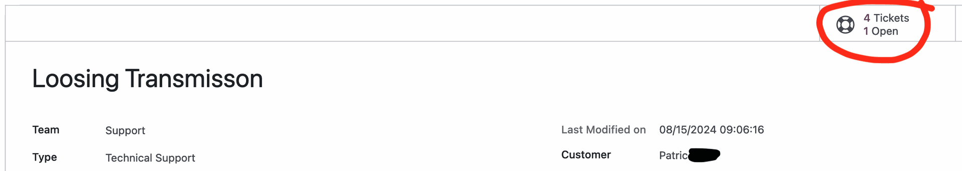 When I go to the same customer's ticket, the smart button shows multiple tickets: